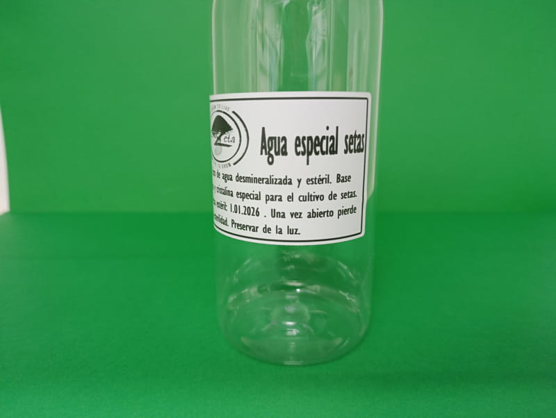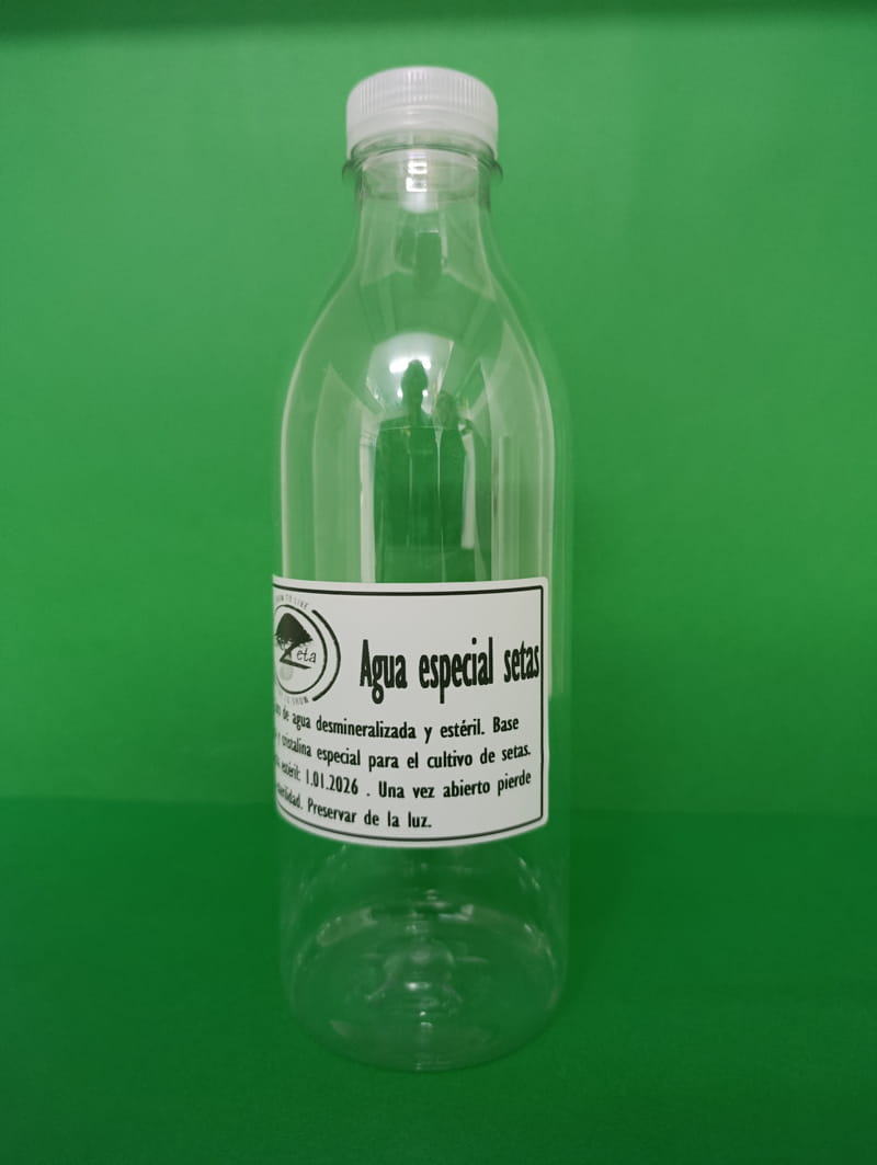 1 Litro de agua desmineralizada, destilada y estéril. Esterilización por vapor a 15 psi. El Agua Especial Setas de ComoZeta ofrece una base pura y equilibrada, sin sales, cloro, ni métales pesados. Indicada para pulverizar kits de cultivo, preparar sustratos, mezclas nutritivas de Agar, agua base de culturas liquidas.