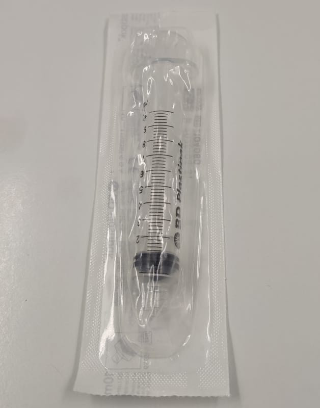 Jeringa 10 ml. estéril desechable de tres piezas con luer lock centrado y pistón elastómero.