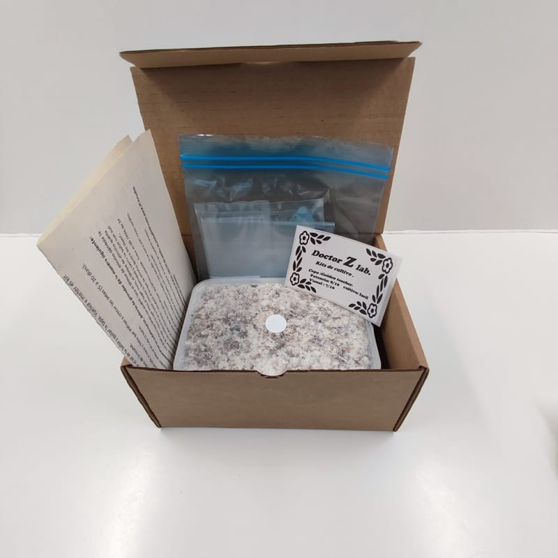 Kit de cultivo Mexicana, compuesto por bloque de micelio de 1000ml. , bolsa de cultivo con filtros para intercambio gaseoso, instrucciones de cultivo y EPI , un par de guantes, una mascarilla y gorro. Cepa originaria de México, se cree que el investigador Albert Hoffman la utilizo para aislar el compuesto de la Psiloc1bina.