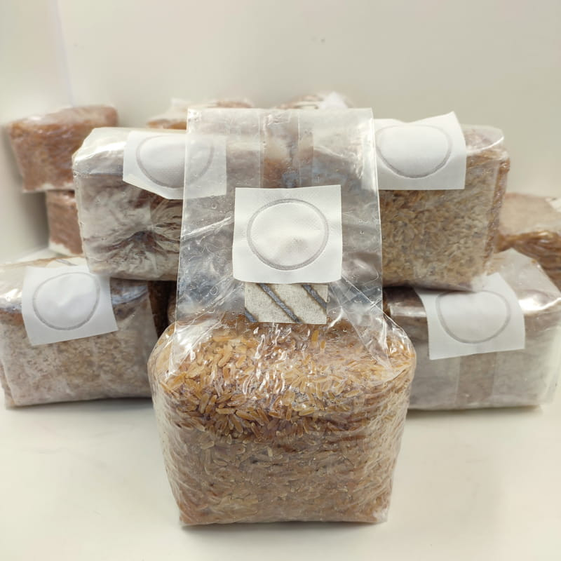 Bolsas de cultivo con grano de cereal; centeno ecológico , colonizado 100% con diferentes tipos de cepas, formato 500 gramos. Con cinta control de esterilización.