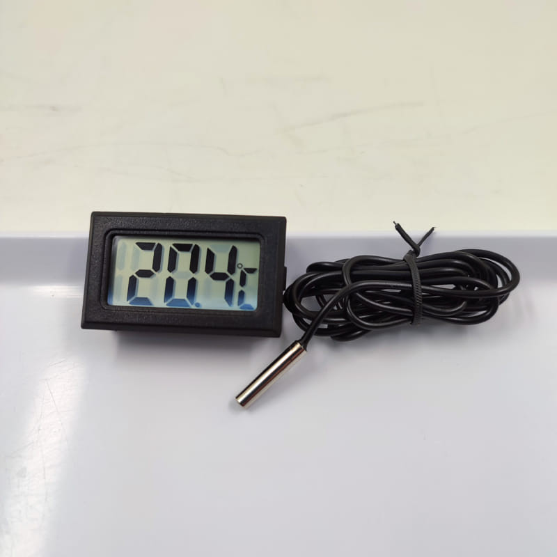 Termómetro digital con sonda de 1 metro de cable, negro. Medidas 4.8×2.9×1.6 centímetros. Dos pilas LR44 incluidas.